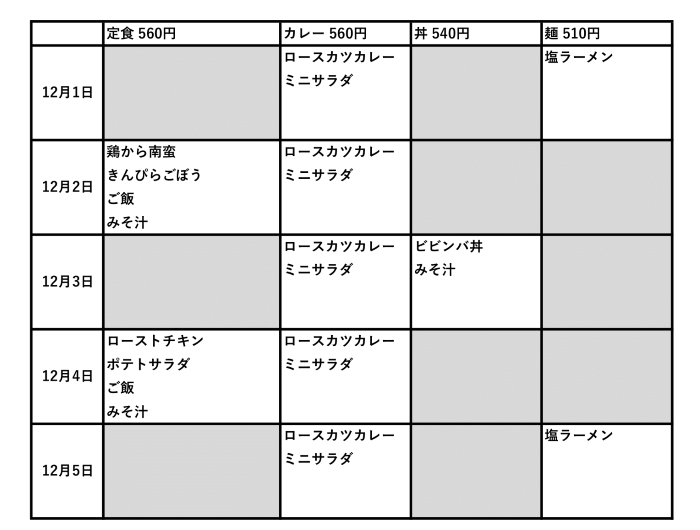 【今週のメニュー】附属中学校食堂 12月1日~12月12日 富山大学生協 附属中学校食堂メニュー情報 毎度ご利用ありがとうございます。こちらで、1週間のメニューをお知らせしております。(急遽、当日メニュー変更があった場合はご容赦下さい)12月1日から12月8日から 関連情報 戻る