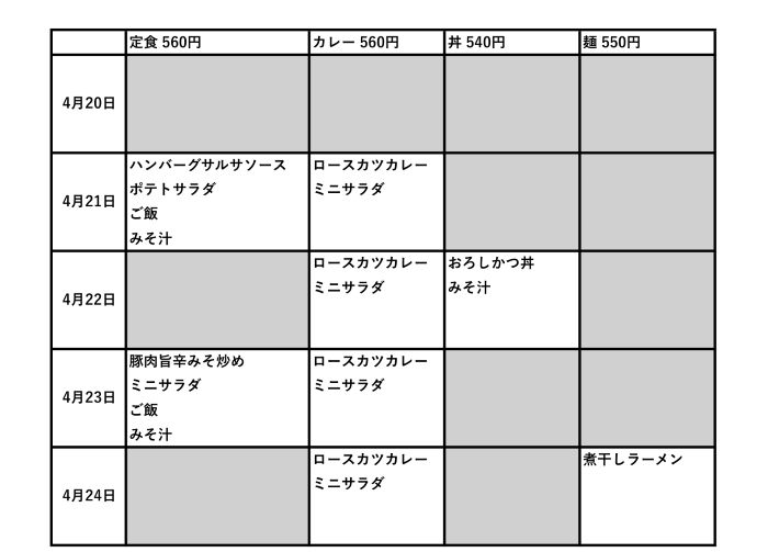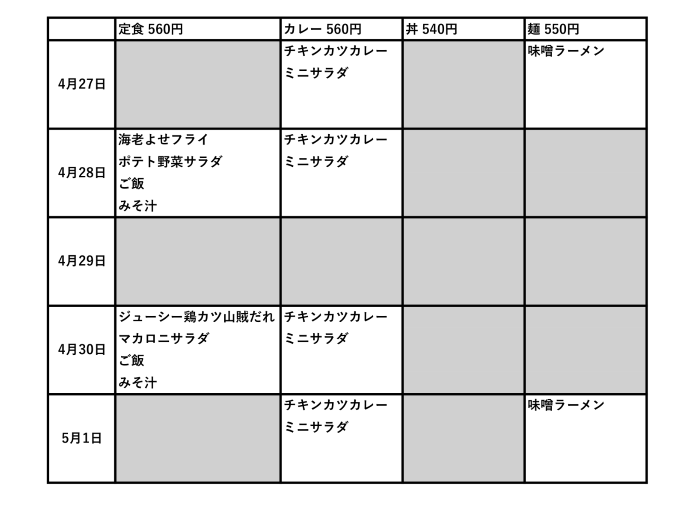 【今週のメニュー】附属中学校食堂 4月20日~5月1日 富山大学生協 附属中学校食堂メニュー情報 毎度ご利用ありがとうございます。こちらで、1週間のメニューをお知らせしております。(急遽、当日メニュー変更があった場合はご容赦下さい)2026年4月20日から2026年4月27日から 関連情報 戻る