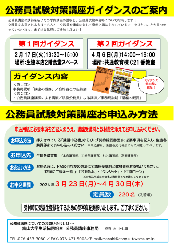 大学生協の学内開講「公務員試験対策講座」<2026年試験対応> (2025年4月14日) 2027年試験対応のガイダンス次回は4月を予定■大学生協の学内開講「公務員試験対策講座」 クリックすると「学生向け案内ページ」にリンクします。 (公務員講座の資料やガイダンス動画の閲覧など)■関連ファイルに「公務員試験対策講座案内パンフレット」をPDFファイルで添付しています。ご覧ください。 関連情報 URL: 「学生向け案内ページ」 関連ファイル 第24期公務員講座案内<P8-P9以外>(PDF)【募集パンフ 生協HP用】第24期公務員講座(P8-P9) (2)_001 戻る